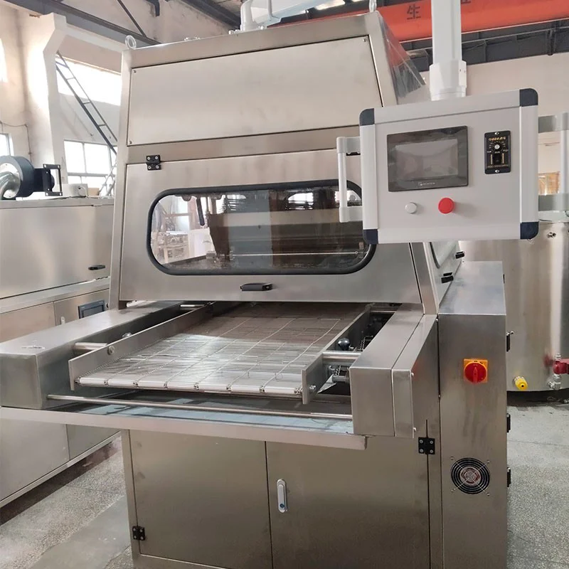 La macchina per ricoprire il cioccolato è l'attrezzatura dedicata per la realizzazione di prodotti di cioccolato assortiti con funzioni di rivestimento intero, rivestimento su un solo lato, rivestimento parziale e raffreddamento. -